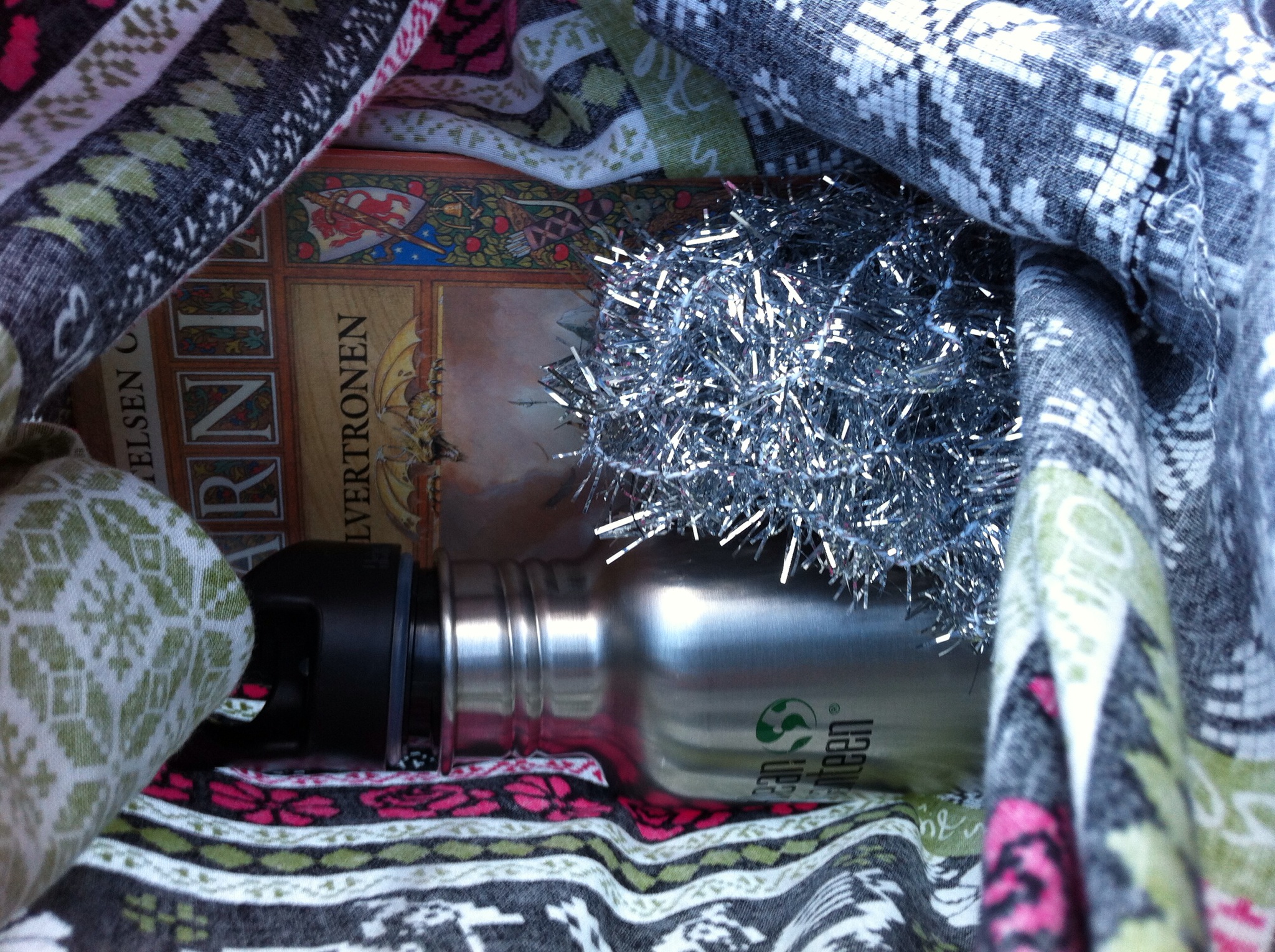 Med mig har jag några saker som kan vara bra att ha. En vattenflaska, en bok och lite glitter (det är ju ändå lucia).