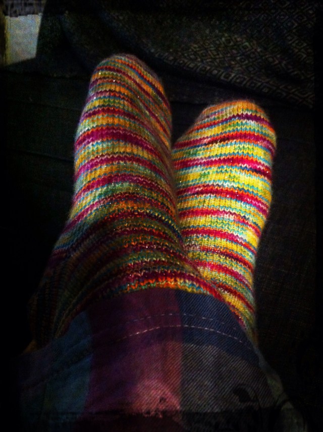 Nya fina strumpor, gjorda speciellt för mig av en mycket god vän. Fina, mjuka, i glada färger och glitter! Me like! 😊
