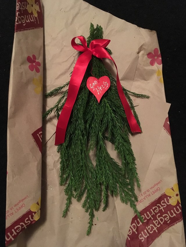 Mamma har varit på besök och hjälper mig att julpynta. Denna ska hängas upp på ytterdörren. 🙂