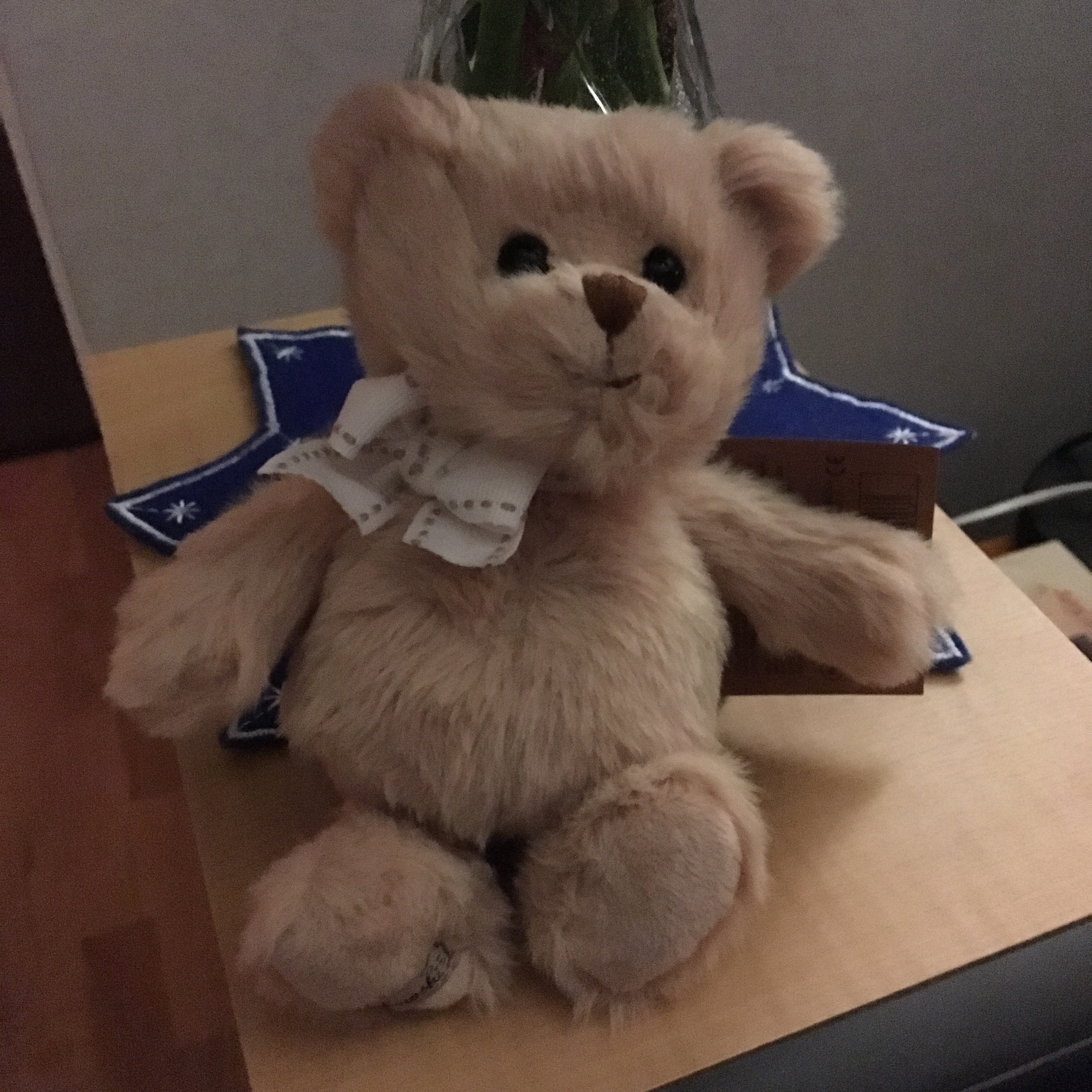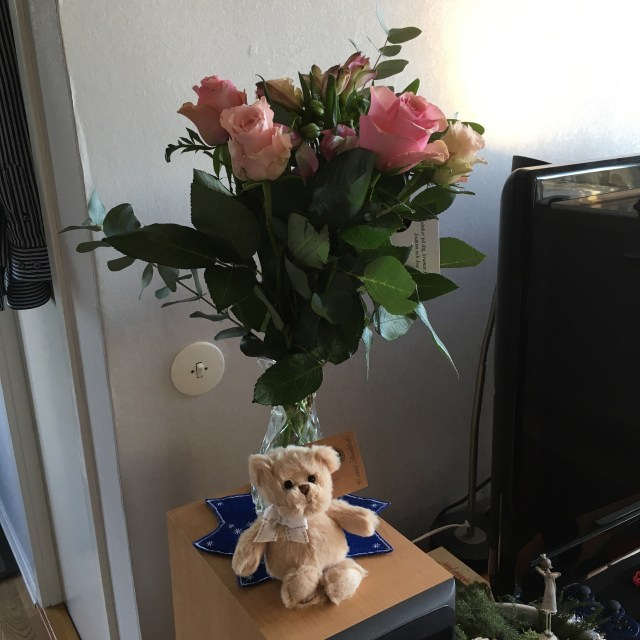 Jag har en ny kompis här hemma. Han kom med ett blomsterbud, är liten, mjuk och ser ständigt glad ut. En maskott helt enkelt. 🙂