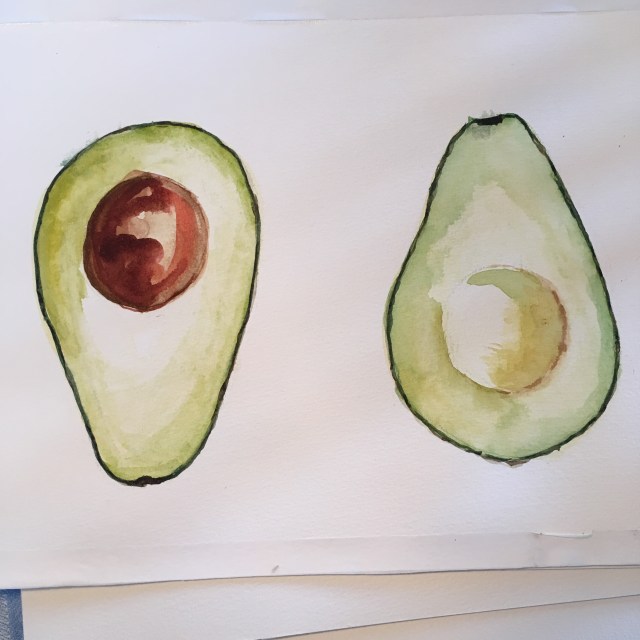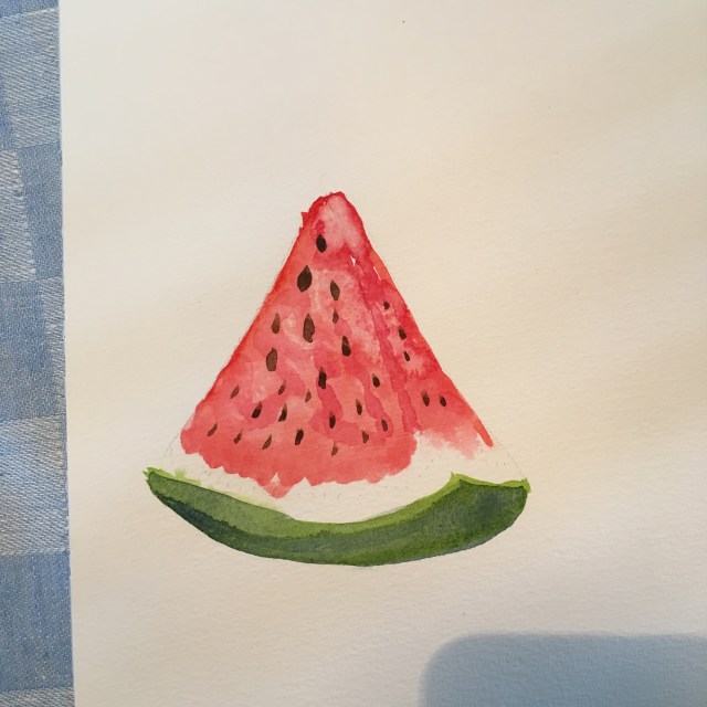 Sommarkurs i akvarellmålning. Själva målandet är knepigt, gruppen ganska stor och arbetet väldigt styrt. Idag målade vi vattenmelon och avokado. 🙂