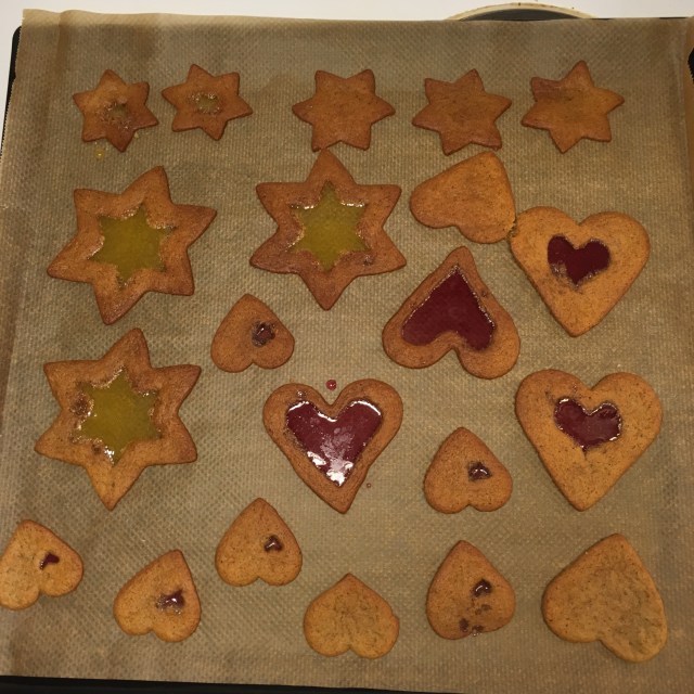 Lek med pepparkaksdeg och krossade halstabletter. Tyvärr glömde jag göra hål för hängning men det ordnar sig nog ändå. 🙂