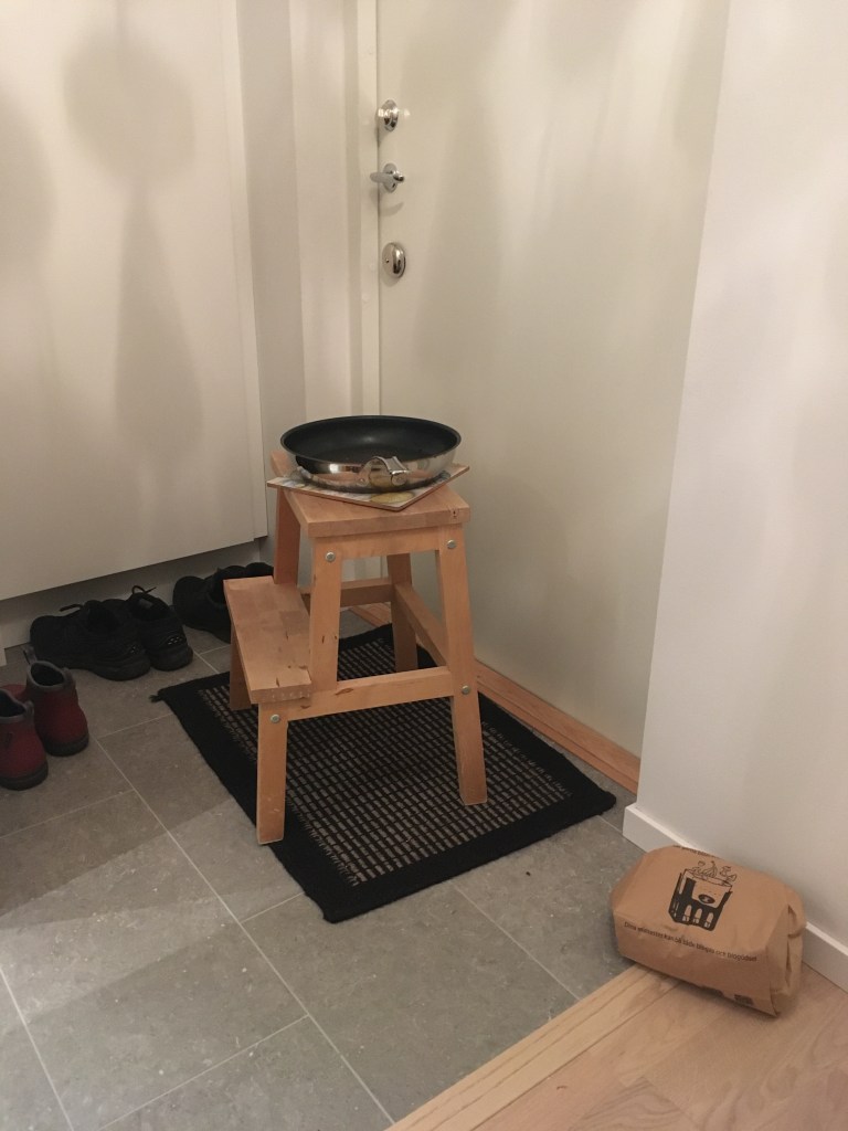När man har flyttat till ny lägenhet som är kliniskt ren från avställningsytor… Då hamnar det varma stekpannan framför ytterdörren.